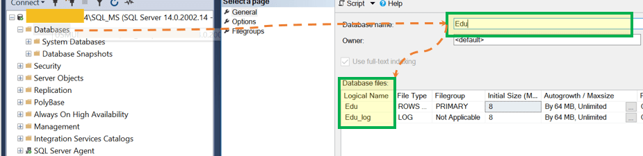 USE [master] GO CREATE DATABASE [Edu] CONTAINMENT = NONE ON PRIMARY ( NAME = N'Edu', FILENAME = N'C:\Program Files\Microsoft SQL Server\MSSQL14.SQL_MS\MSSQL\DATA\Edu.mdf' , SIZE = 8192KB , MAXSIZE = UNLIMITED, FILEGROWTH = 65536KB ) LOG ON ( NAME = N'Edu_log', FILENAME = N'C:\Program Files\Microsoft SQL Server\MSSQL14.SQL_MS\MSSQL\DATA\Edu_log.ldf' , SIZE = 8192KB , MAXSIZE = 2048GB , FILEGROWTH = 65536KB )