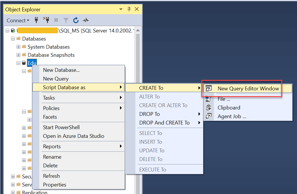 您可以通过以下方式查看新创建的“Edu”数据库的源查询:导航:右键单击数据库名称 > 脚本数据库为 > 创建到 > 新建查询编辑器窗口。
