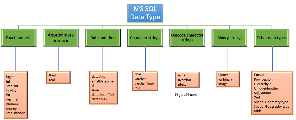- 有六个主要类别和一个其他杂项类别。其他杂项类别有九个子类别,提供 SQL server 数据类型和大小。