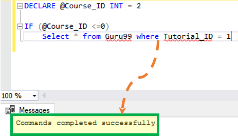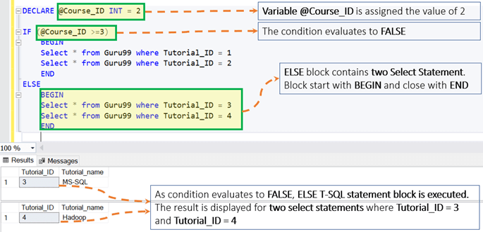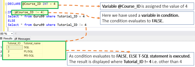 DECLARE @Course_ID INT = 2 IF (@Course_ID <=2) BEGIN Select * from Guru99 where Tutorial_ID = 1 Select * from Guru99 where Tutorial_ID = 2 END ELSE BEGIN Select * from Guru99 where Tutorial_ID = 3 Select * from Guru99 where Tutorial_ID = 4 END