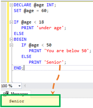 - 如果 @age 的值小于 50,它将打印 You are below 50。如果这些条件都不为真,代码将打印 Senior。