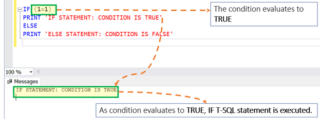 IF (1=1) PRINT 'IF STATEMENT: CONDITION IS TRUE' ELSE PRINT 'ELSE STATEMENT: CONDITION IS FALSE'