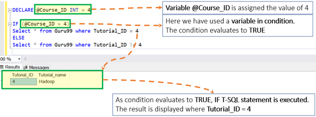 DECLARE @Course_ID INT = 4 IF (@Course_ID = 4) Select * from Guru99 where Tutorial_ID = 4 ELSE Select * from Guru99 where Tutorial_ID != 4