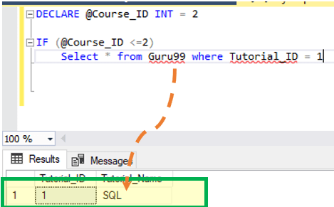 DECLARE @Course_ID INT = 2 IF (@Course_ID <=2) Select * from Guru99 where Tutorial_ID = 1