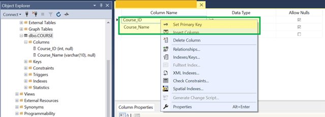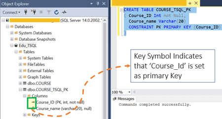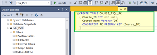 CREATE TABLE COURSE_TSQL_PK (Course_ID Int not Null, Course_name Varchar(20) CONSTRAINT PK PRIMARY KEY (Course_ID) )