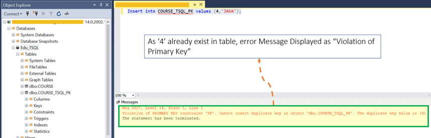Insert into COURSE_TSQL_PK values (1,'SQL'); Insert into COURSE_TSQL_PK values (2,'Python'); Insert into COURSE_TSQL_PK values (3,'SQL'); Insert into COURSE_TSQL_PK values (4,'C');
