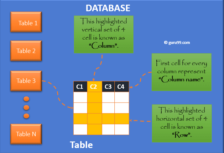 表格是存储数据的对象,它以行和列的格式存储。下图分别显示了行和列。