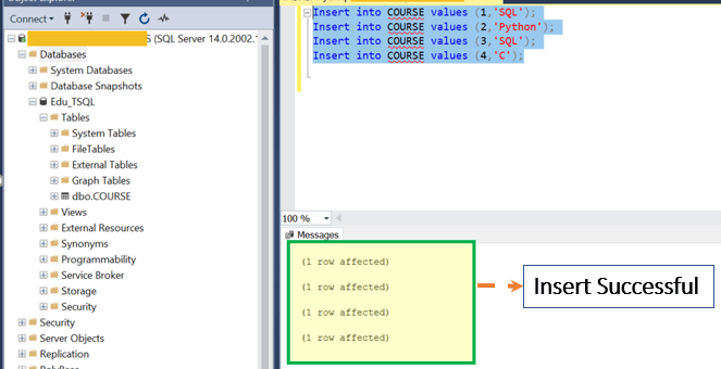 Insert into COURSE values (1,'SQL'); Insert into COURSE values (2,'Python'); Insert into COURSE values (3,'SQL'); Insert into COURSE values (4,'C');