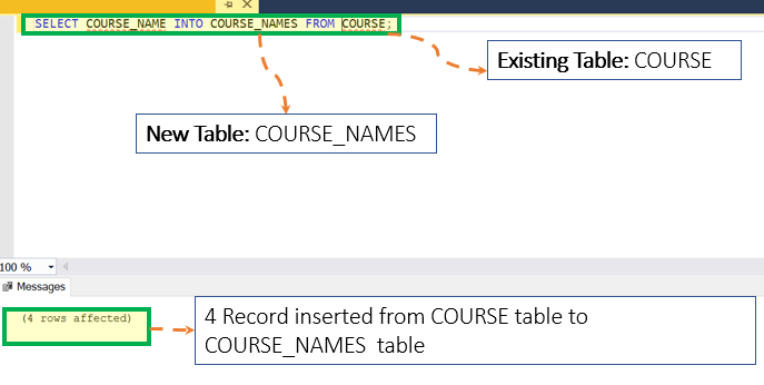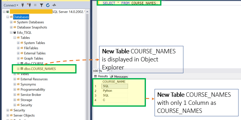 结果:使用旧表格的 1 列和四条记录创建了名为COURSE_NAMES的新表格。