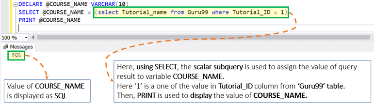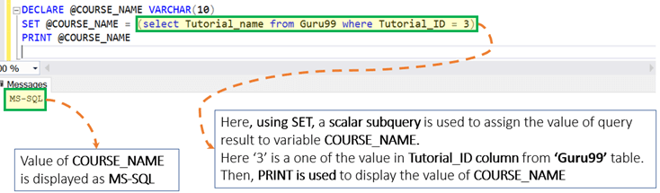 DECLARE @COURSE_NAME VARCHAR (10) SET @COURSE_NAME = (select Tutorial_name from Guru99 where Tutorial_ID = 3) PRINT @COURSE_NAME