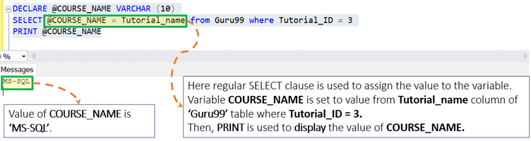 DECLARE @COURSE_NAME VARCHAR (10) SELECT @COURSE_NAME = Tutorial_name from Guru99 where Tutorial_ID = 3 PRINT @COURSE_NAME