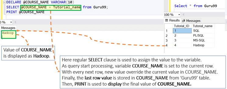 DECLARE @COURSE_NAME VARCHAR (10) SELECT @COURSE_NAME = Tutorial_name from Guru99 PRINT @COURSE_NAME