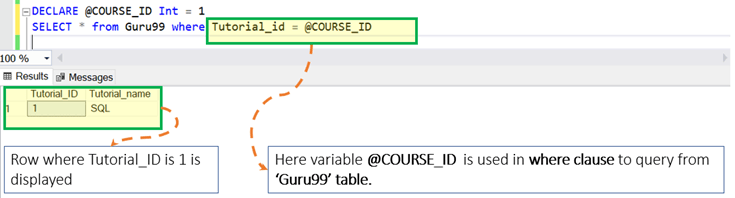 DECLARE @COURSE_ID Int = 1 SELECT * from Guru99 where Tutorial_id = @COURSE_ID