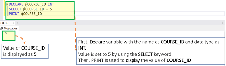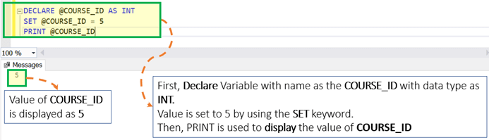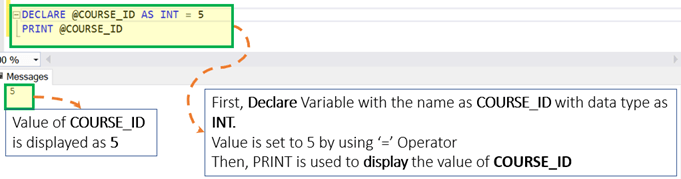 DECLARE @COURSE_ID AS INT = 5 PRINT @COURSE_ID