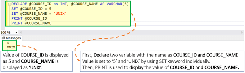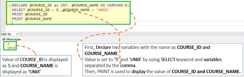 DECLARE @COURSE_ID as INT, @COURSE_NAME AS VARCHAR(5) SELECT @COURSE_ID = 5, @COURSE_NAME = 'UNIX' PRINT @COURSE_ID PRINT @COURSE_NAME