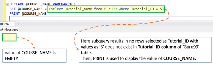 DECLARE @COURSE_NAME VARCHAR (10) SET @COURSE_NAME = (select Tutorial_name from Guru99 where Tutorial_ID = 5) PRINT @COURSE_NAME
