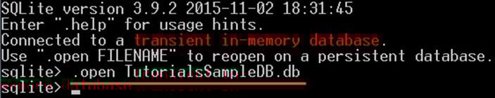 第 2 步:使用以下命令打开数据库“TutorialsSampleDB.db”