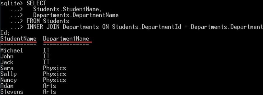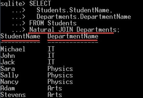 - SQLite 会自动推断连接条件,并比较 Students 和 Departments 这两个表中的 DepartmentId。