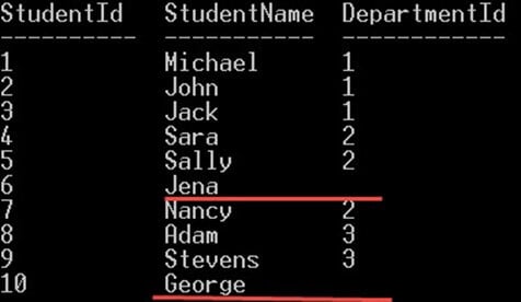 - 正如您所看到的,Students 表中的所有行都包含在内,总共有 10 名学生。即使第四名和最后一名学生 Jena 和 George 的 departmentIds 不存在于 Departments 表中,它们也被包含在内。