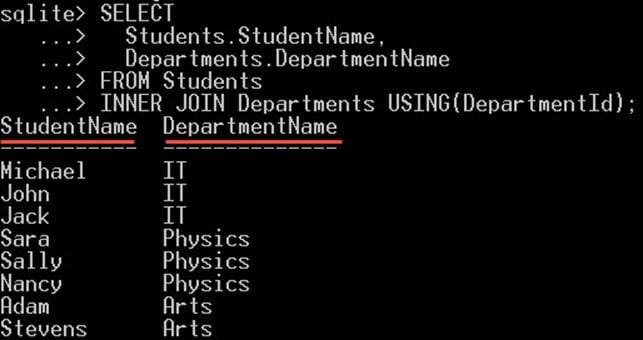 - 与前面的示例不同,我们没有写“ON Students.DepartmentId = Departments.DepartmentId”。我们只是写了“USING(DepartmentId)”。