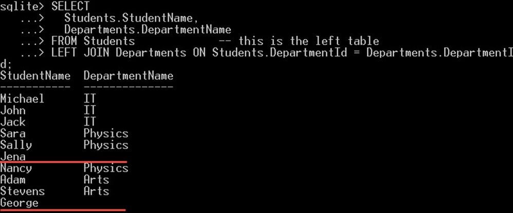 SELECT Students.StudentName, Departments.DepartmentName FROM Students -- this is the left table LEFT JOIN Departments ON Students.DepartmentId = Departments.DepartmentId;