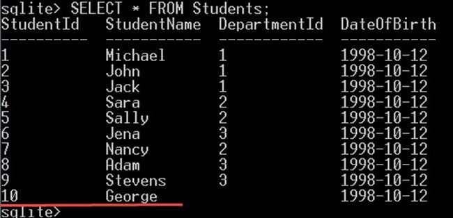您可以通过运行以下命令选择 Students 表中的所有记录来验证这两个学生是否已被删除