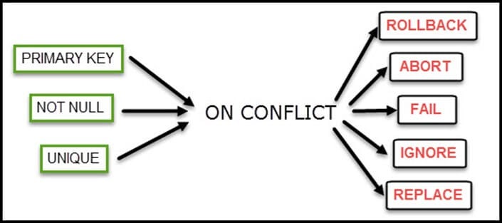 - ROLLBACK – 这将回滚当前具有冲突的 SQLite 语句所在的事务(它将取消整个事务)。例如,如果您尝试更新 10 行,而第五行中的值与约束冲突,则不会更新任何行,这 10 行将保持不变。将抛出错误。