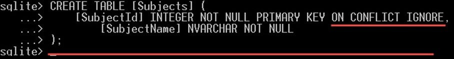 请注意,我们为 SubjectId 列定义了 PRIMARY KEY 约束。主键约束不允许在 SubjectId 列中插入两个重复值,因此该列中的所有值都应是唯一的。另外,请注意,我们选择的冲突解决办法是“IGNORE”。
