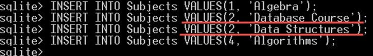在这些 INSERT 语句中,我们试图插入两个具有相同主键 Subject id 2 的课程,这违反了主键约束。