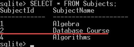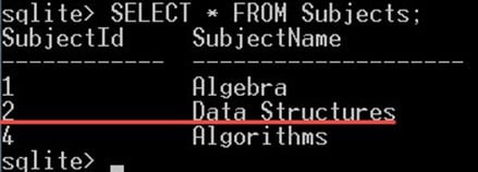 - SQLite 将为此次冲突选择 REPLACE 解决方案。它用 insert 语句中的新值替换 subjects 表中已存在的值。因此,“数据库课程”SubjectName 将被“数据结构”SubjectName 替换。