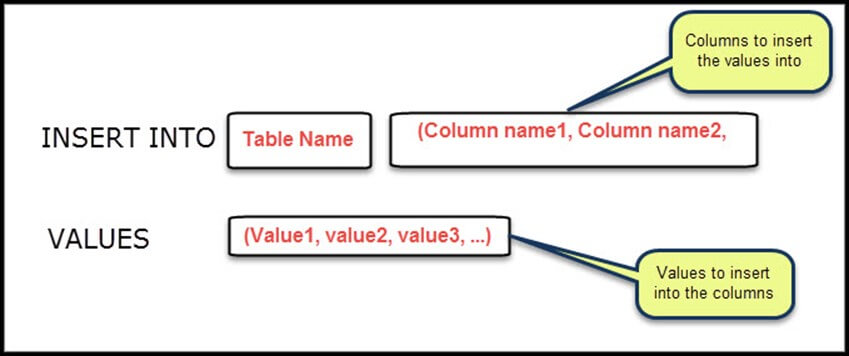 - 在 INSERT 子句之后,您应说明需要将值插入到哪个表中。