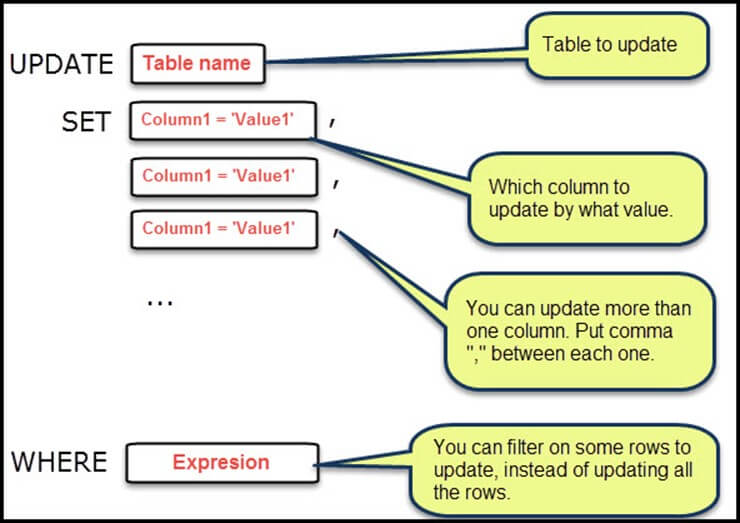 - 您可以更新多个列。您可以在每行之间使用逗号。