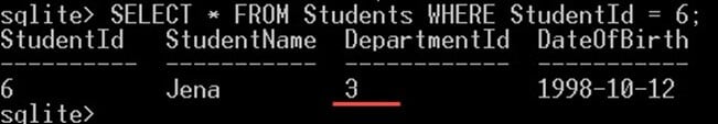 在以下 UPDATE 语句中,我们将把 StudentId 为 6 的学生的 DepartmentId 更新为 3