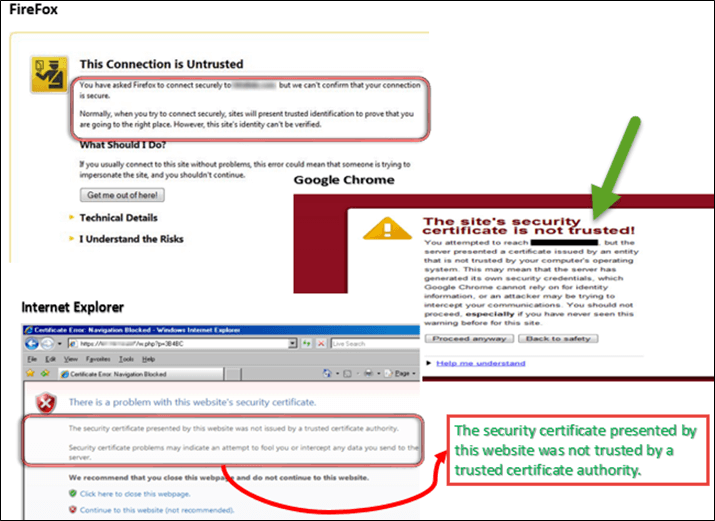 由于证书问题,您在不同浏览器中可能会看到以下类型的错误: