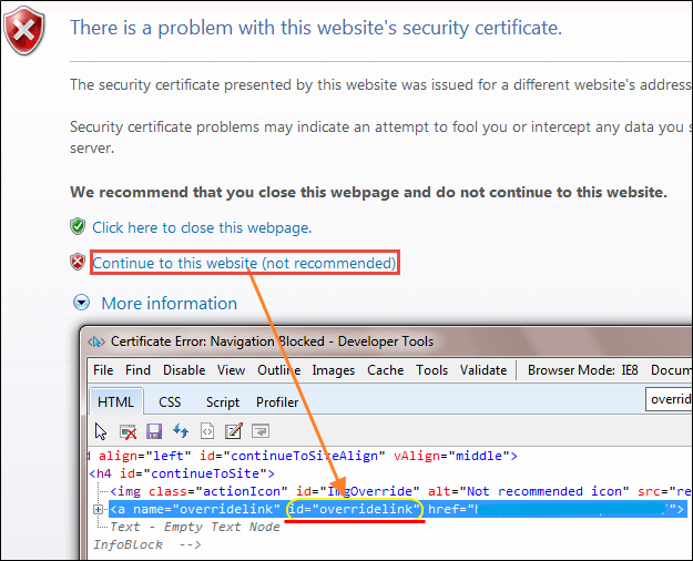 在IE浏览器中观察SSL证书错误,您会发现“继续访问此网站(不推荐)”链接。此链接的ID为“override link”。您可以使用F12在HTML模式下查看此ID。