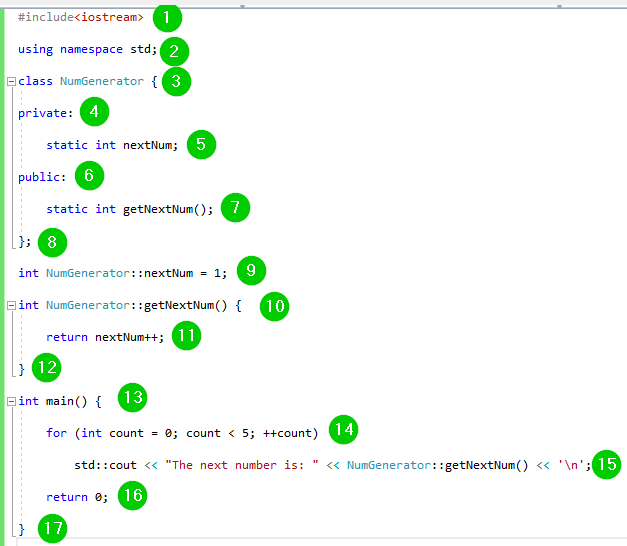 std::cout << "The next number is: " << NumGenerator::getNextNum() << '\n';