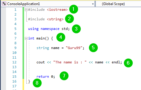 - 声明一个字符串并将其命名为 name。该字符串将存储 Guru99 的值。