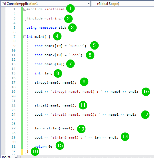 - 声明一个 10 个字符的字符串并将其命名为 name1。该字符串将存储 Guru99 的值。