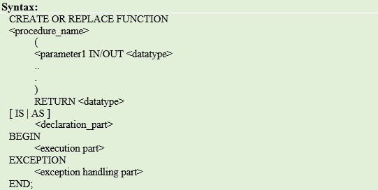 CREATE OR REPLACE FUNCTION <procedure_name> ( <parameterl IN/OUT <datatype> ) RETURN <datatype> [ IS | AS ] <declaration_part> BEGIN <execution part> EXCEPTION <exception handling part> END;