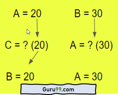 - 将 C 的值赋给 B,所以 B = 20,因为 C 有值 20。