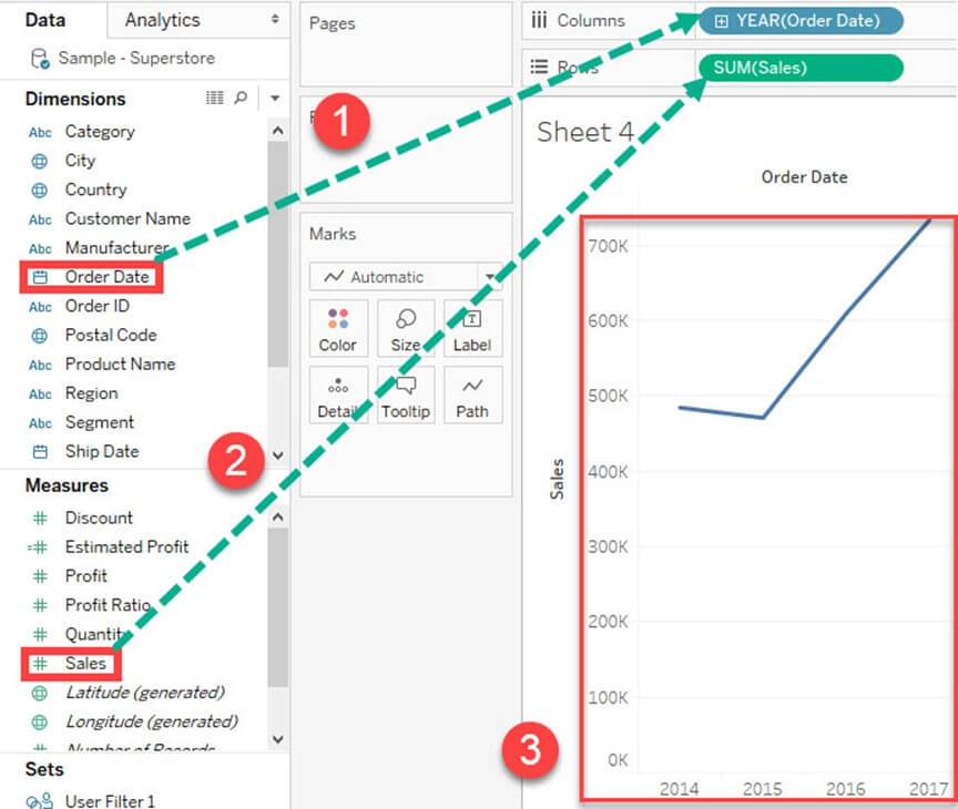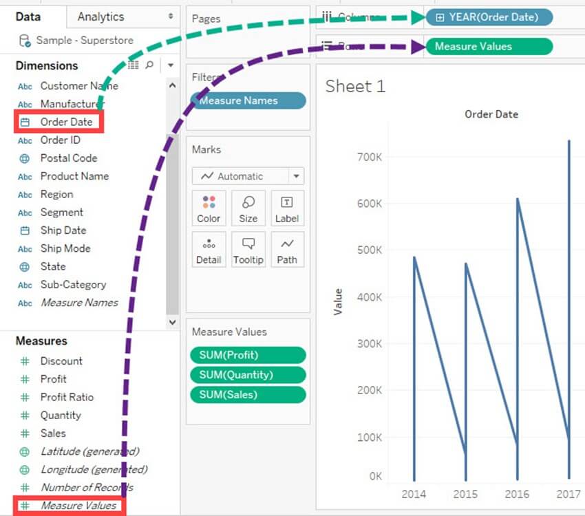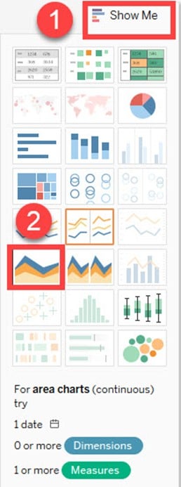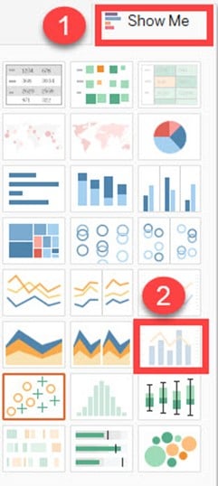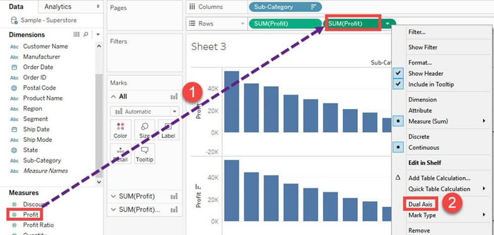 双轴图可用于在两种不同的图表类型中可视化两个不同的度量。日期列和两个度量是构建双轴图所必需的。图中使用的不同刻度有助于用户理解这两个度量。创建双轴图的过程如下所示。