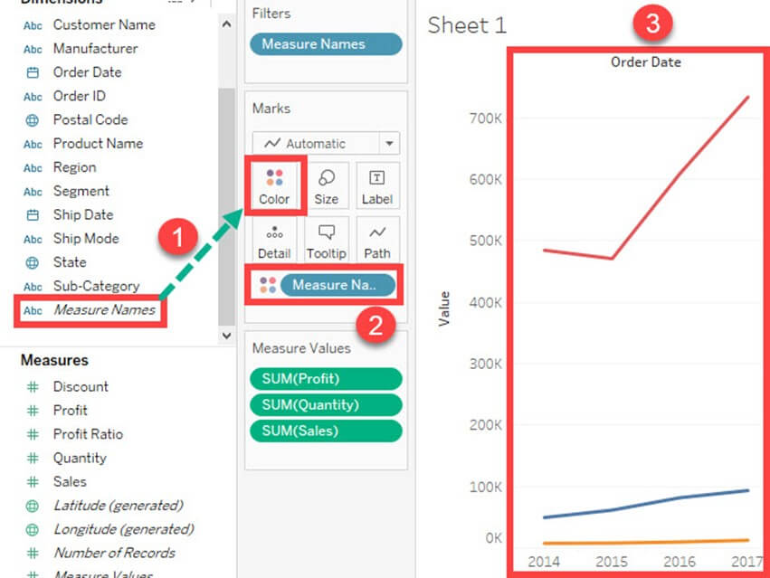 - 将“度量名称”拖到标记卡中的“颜色”选项。