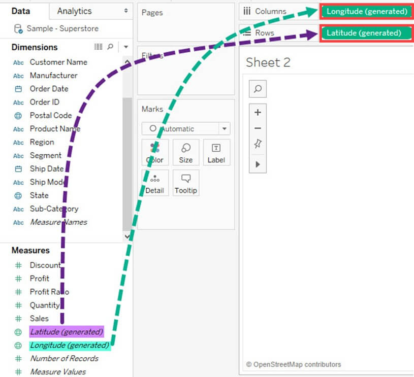 经度和纬度(生成)字段与数据中存在的地理详细信息相关联。数据集应包含地理详细信息,如城市、国家或州。经度和纬度值在 Tableau 中是自动生成的。这些字段可用于在 Tableau 中构建地图。使用经度和纬度创建地理地图的方法如下: