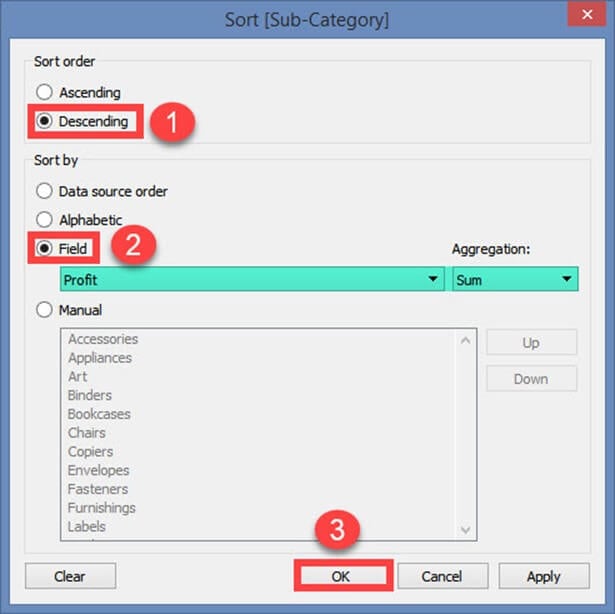 - 在“排序依据”部分选择“字段”。选择“利润”字段,并选择“求和”作为聚合。