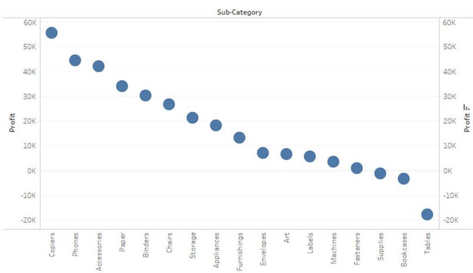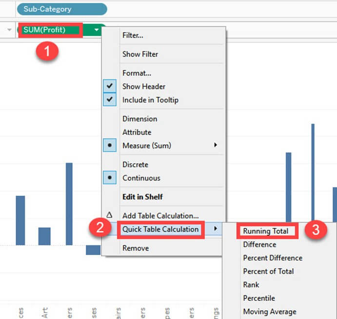 瀑布图可以可视化度量在维度上的累积效应。它可以显示维度中每个成员的增长或下降的贡献。例如,您可以使用瀑布图查看每个子类别的利润贡献。可以通过遵循以下过程在 Tableau 中设计瀑布图。