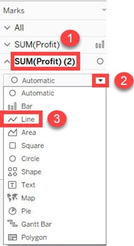 步骤 6) 从标记卡列表中选择“SUM(Profit)(2)”。