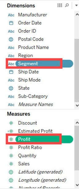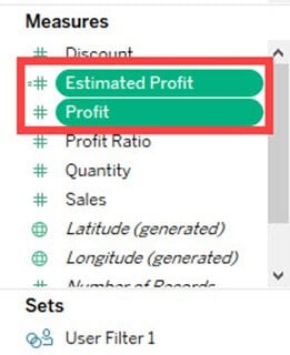 步骤 3) 转到数据窗格中的度量。按住键盘上的 Ctrl 键,然后选择“估计利润”和“利润”。