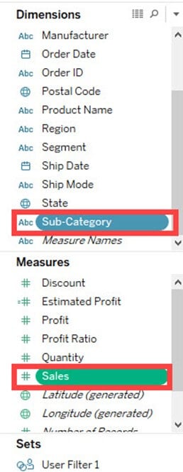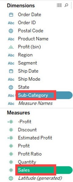 - 按住键盘上的 Ctrl 键,然后从数据窗格中选择“子类别”和“销售额”。
