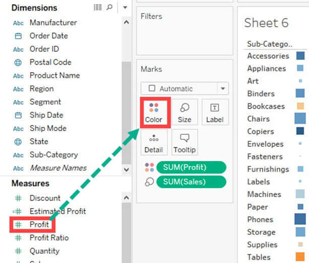 步骤 3) 将“利润”拖到“颜色”框。