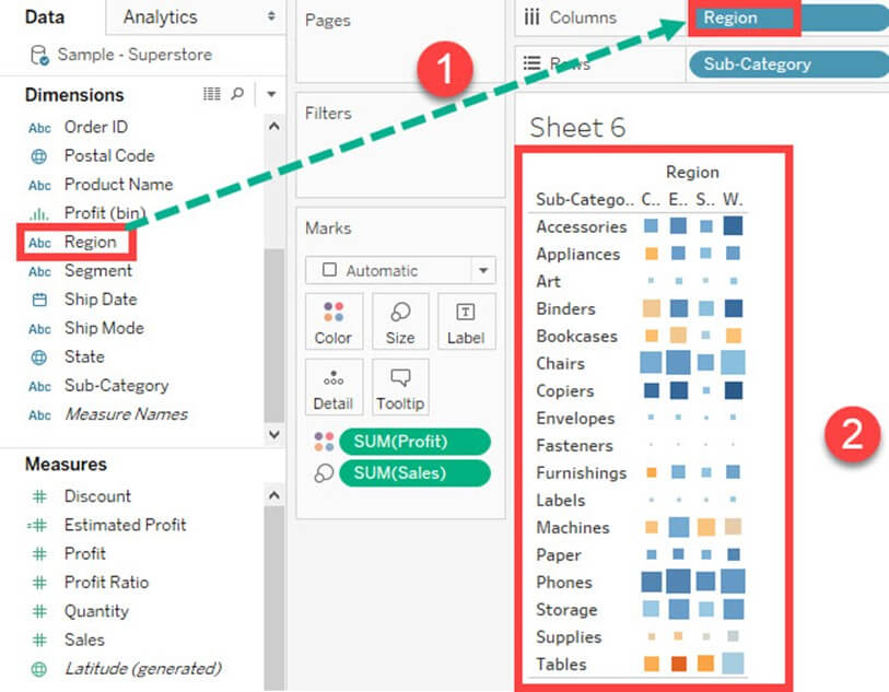 - 这将创建一个热力图。可用于可视化不同维度的销售额和利润。